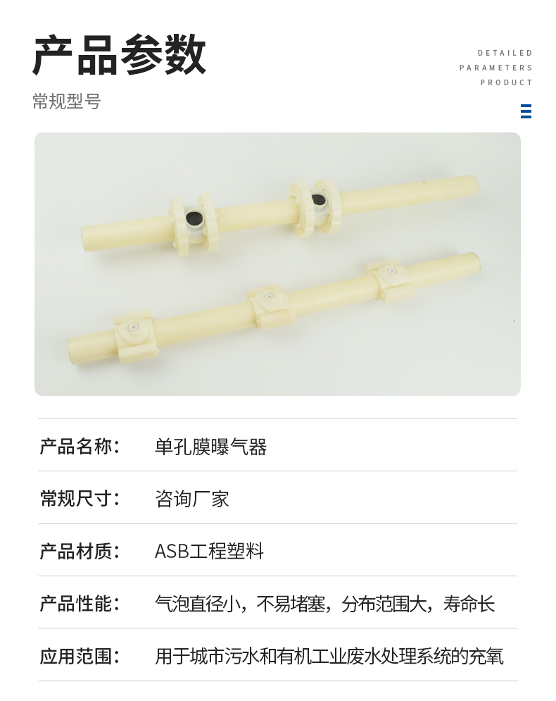 單孔膜曝氣器,是BAF曝氣系統中的重要部件,能為好氧微生物提供充足的溶解氧。單孔膜曝氣器不受池內溫度與氣溫之差,不受濾池高度及生物陶粒濾料空隙率影響,氣泡直徑小,分布范圍大,曝氣器出氣口設計有獨特的凹凸結構,不易被堵塞,不怕生物陶粒濾料堆壓。由于其結構特殊,所以在安裝、使用中需要按照相關要求進行操作。